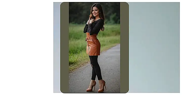 This girl is rocking a look that’s totally chic! She’s got on a black top that looks super comfy, but the star of the show is definitely that amazing brown leather skirt! It’s like a little piece of sunshine in a world of boring jeans. And those heels? Don’t even get me started! They’re the perfect finishing touch to an outfit that screams “I’m confident and ready to take on the world!”