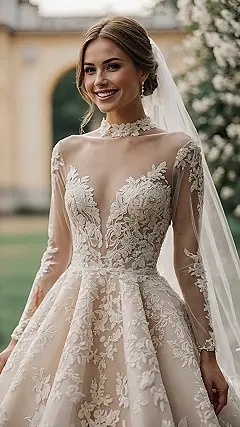 Forget those wedding dresses that look like giant whipped cream cones you might trip over. This one in the picture is totally next-level unique! Check out that incredible lace – it’s not just tacked on, it’s everywhere, doing its own fancy thing, especially around the neck like a cool high collar necklace that’s built into the dress. And those see-through lacy sleeves? Seriously chic and totally different. It looks like someone decided ‘basic’ was boring and went full-on ‘work of art’ with this bridal situation.