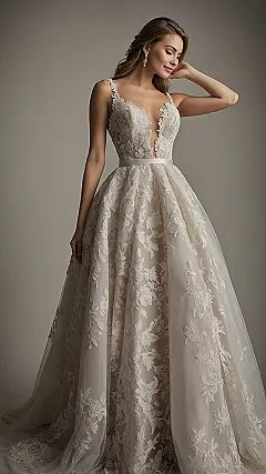 Now, let’s talk about the skirt – it’s practically a cloud of dreamy lace, ready for the biggest entrance ever! With all those beautiful floral patterns shimmering, it’s screaming “classy wedding dress” without having to shout. You could totally do an epic twirl in this, feeling like you’re floating, probably getting ready to steal all the spotlight (in the best way possible, of course). It’s the kind of dress that makes you want to dance all night, even if your feet are secretly screaming inside your fancy shoes!