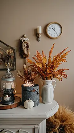 Pumpkins, pine cones, and a warm candle – what more could you ask for in fall decor? These classic elements can be dressed up or down depending on your style. They’re like the comfy, neutral sweater you can wear to a fancy dinner or a casual movie night. This image shows a simple, elegant way to embrace the season, with a focus on natural colors and textures that are both stylish and welcoming.