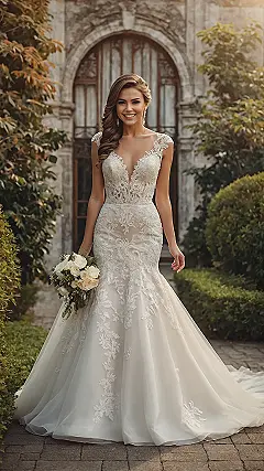 Talk about making an entrance! This amazing “fit and flare” wedding dress totally gets it. See how it hugs everything perfectly on top, like it was custom-made just for her? That’s the “fit” part doing its magic, showing off her awesome silhouette without needing any fancy Instagram filters. Plus, those lacy sleeves and the gorgeous neckline are giving off serious main character vibes, making her look ready to glide down the aisle, probably even before her morning coffee. She looks so confident, you just know she’s thinking, “Yep, I woke up like this, looking this fabulous.”
