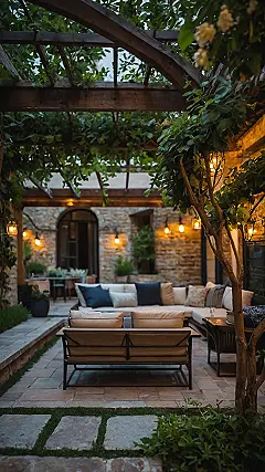 This Italian patio looks like the official headquarters for chilling out. You could sink into those super-comfy chairs and just forget about everything, maybe even fall asleep under the leafy canopy. With the soft glow of the lights, it feels like a secret hideout designed purely for doing absolutely nothing important – you just know if you sat here long enough, someone would magically appear with a giant plate of spaghetti and tell you to relax, it’s Italy time!