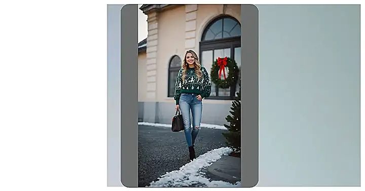 Notice how the ripped jeans add a little edge, even with a dash of snow on the ground? It’s like saying, ‘I’m embracing winter, but I’m still cool enough for a breeze!’ With that chic black bag and those sharp ankle boots, this isn’t just a sweater thrown on – it’s a whole vibe. This outfit is perfect for hitting up holiday markets, grabbing a fancy coffee, or even just looking effortlessly stylish while waiting for your friends to finally decide on a movie. It’s festive, fashionable, and looks ready for any winter wonderland adventure.