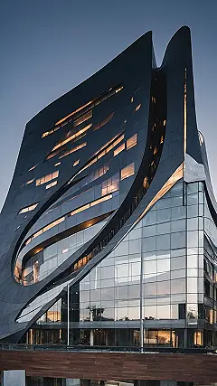 Look at this building! It’s like someone told the architect, “Forget straight lines, let’s make it groovy!” and they absolutely delivered. This isn’t your grandma’s rectangular office block; it’s a wavy, swirly masterpiece that looks like it’s doing a really complicated dance move. This curved modern architecture probably makes all the other boring, boxy buildings feel a bit jealous, standing there all stiff. With its dramatic twists and turns, it proves that buildings can definitely have more personality than a whole class of drama students, especially with those scattered, glowing windows looking like tiny golden secrets.