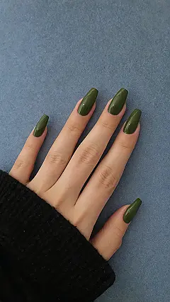 Let’s talk about these awesome green nails! They’re not just green, they’re like the coolest shade of olive, making you look ready for anything from a sophisticated tea party to plotting world domination (in a totally stylish way, of course). With that perfect coffin shape and glossy finish, these nails are definitely serving up some serious main character energy, leaving everyone else green with envy and wondering where you got your manicure done.