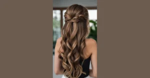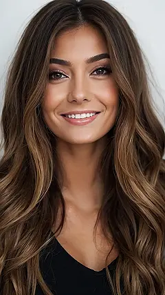 The picture shows hair that looks like a warm hug for your locks. It’s all about beautiful brown hair with streaks of lighter brown, like the leaves changing color in the fall! It’s like taking the best parts of summer, those golden rays of sunshine, and bringing them to your hair.