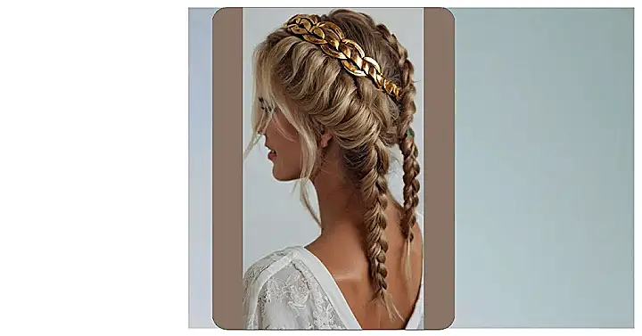 **Paragraph 1:** Whoa, check out this hairstyle! It’s like a total mashup of hippie vibes and ancient Greek goddess glam. Imagine a flower child from the 60s who decided to time travel and borrow a crown from a statue. That gold chain headband is seriously awesome, right? It’s giving major royalty feels, but with a super relaxed, boho twist. Those perfectly braided pigtails keep things modern, while the loose, wavy hair up top adds a touch of effortless coolness. It’s definitely the kind of ‘do that would turn heads whether you’re at a music festival or a toga party (if you ever got invited to one of those!).
