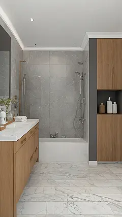 Remember those old, kinda sad bathrooms with chipped tiles and questionable lighting? Well, say goodbye to those shower nightmares, because this incredible bathroom remodel looks like it popped straight out of a magazine! With those sleek grey marble walls and sparkling white floors, you might just start taking extra-long showers just to soak it all in. Plus, imagine having a vanity this long – no more fighting for counter space when you’re trying to get ready in the morning, which is a major win for anyone who actually likes getting to school on time.