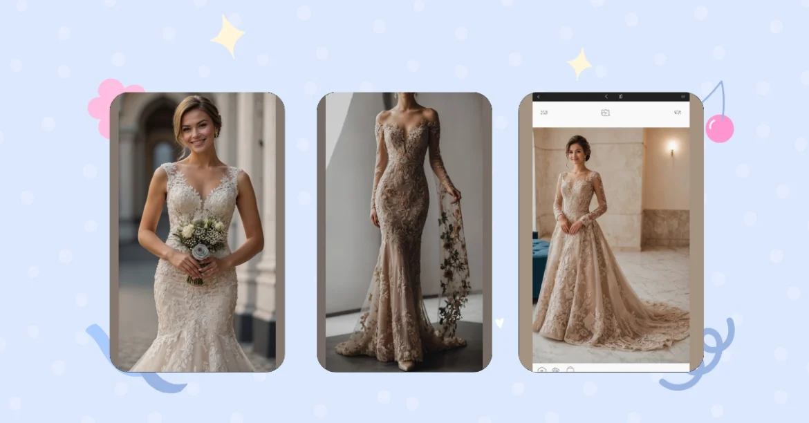 Whoa, hold up! Is this a wedding dress or did someone discover a hidden treasure chest filled with pure magic? This gold-toned beauty isn’t just any gown; it’s practically glowing, ready to make whoever wears it feel like royalty. With all that intricate lace and those delicate flowers, it’s like a garden party exploded in the fanciest way possible. You might need sunglasses just to look at it, it’s that stunning – definitely not your grandma’s lace doily, unless your grandma was secretly a queen.