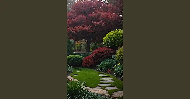 Imagine stepping into this garden, the air crisp and cool. It’s like walking through a painting! The fiery red leaves of the maple tree are so bright, they practically glow against the lush green grass. The stone pathway meanders through the colorful landscape, inviting you to explore.