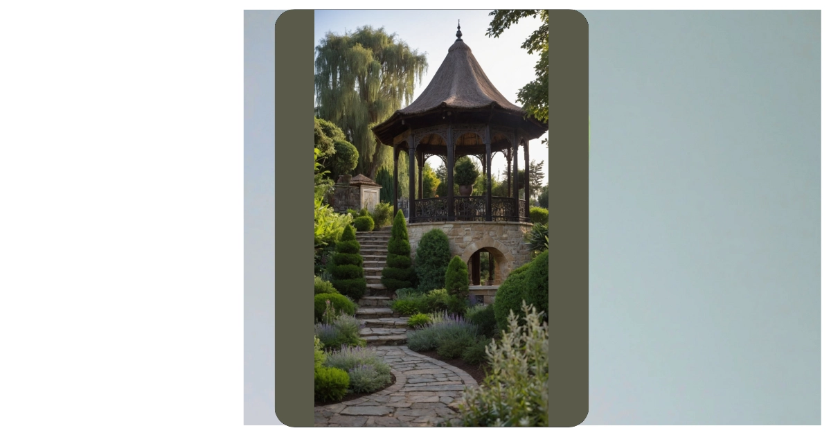 This garden isn’t just a garden; it’s practically a level from a fantasy video game where you go to recharge your health points! Who needs a bland backyard when you could have this dreamy home garden complete with a majestic gazebo that probably hosts secret meetings of garden gnomes after dark? Those perfectly trimmed little trees look like they’re ready to march, guarding the winding path that leads straight to pure relaxation. You could totally pretend you’re royalty strolling through your grounds, or just find the perfect, quiet spot to finally finish that history project you’ve been putting off (maybe).