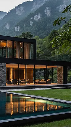 Whoa, check out this place! It’s like someone decided to build a super-modern fort right in the middle of a postcard, but instead of roughing it, they brought along every luxurious thing they could find. This forest mansion isn’t just big; it’s practically made of glass, meaning you’d have the best seat in the house for every single sunset over that shimmering river. I bet the nearest neighbor is a very confused squirrel, wondering why there’s a glowing palace in its backyard and if there’s an open-house tour with free snacks. Just imagine trying to explain to your friends that your “rustic” weekend getaway involves floor-to-ceiling views of actual mountains and a river that looks like melted gold.