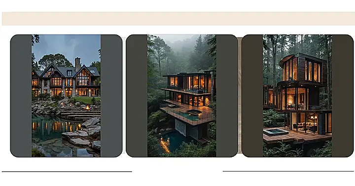 This isn’t just a house; it’s a sleek, glass-encased masterpiece that decided to play hide-and-seek in the middle of a misty forest. With more windows than a shopping mall, you’d practically be living outdoors, just with much better Wi-Fi (hopefully!). It looks like the kind of forest mansion where you’d spend your mornings sipping fancy juice, wondering if that rustling in the bushes is a rare bird or just your sibling trying to sneak a snack from the kitchen. Forget having nosy neighbors; your biggest concern would be remembering where you parked your car on that winding, tree-lined road.