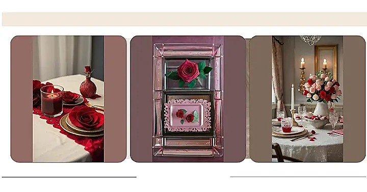 This Valentine’s Day table setting is seriously #relationshipgoals! Imagine the look on your date’s face when they see this gorgeous arrangement of pink and red roses. It’s like a fairytale come to life—all those pretty petals scattered on the table, the candlelight casting a warm glow, and those delicious-looking drinks. Forget chocolates; this is the ultimate romantic treat, and way more impressive than anything you’ll find at the store!