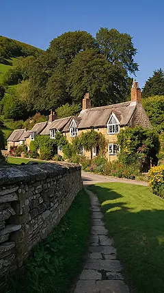 This picture makes you want to grab a cup of tea and a good book, right? It’s like stepping into a classic English village scene straight out of a novel! Those quaint little cottages with their thatched roofs and charming gardens? You can almost hear the birds chirping and smell the freshly baked bread coming from a nearby bakery. Imagine walking down the path, with its stone steps and a wall made of uneven rocks, feeling the cool air on your face as you soak in the peaceful atmosphere.