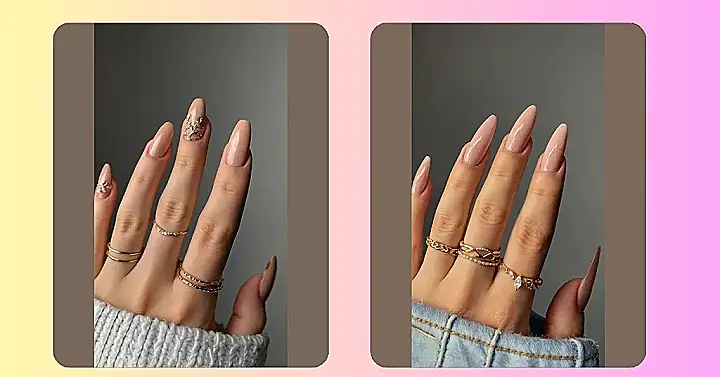 These nails are the epitome of “pretty in pink,” but in a grown-up way. Forget those bright, loud colors; this is subtle elegance at its finest. The pointed almond shape is super trendy right now, and it makes your fingers look long and graceful (even if you think they’re not!). Plus, the tiny sparkling flowers add a touch of sparkle without being too flashy – kind of like a secret treasure hidden on your finger. If you’re looking for chic and classy nail designs to add a subtle shimmer to your style, look no further!