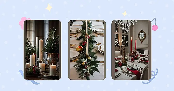Wow, check out this holiday tablescape! It’s like someone sprinkled magic all over a dining table. We’ve got flickering candles creating a warm, cozy glow, miniature pine trees adding a touch of festive green, and pinecones scattered around like nature’s tiny ornaments. It’s the perfect setting for a holiday feast with your family – maybe even with some extra-delicious desserts!