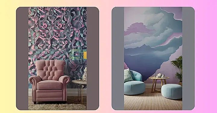 That wallpaper is seriously wild! It’s like a swirling mix of colors and shapes, a bit like if a painter got really, really into abstract art and decided to cover a whole wall with it. Imagine trying to explain this design to your grandma! But hey, that dusty rose armchair looks super comfy nestled against it. It’s like the chillest, most stylish spot in the house for a good book and some quiet time – especially if you’re trying to avoid explaining the wallpaper.