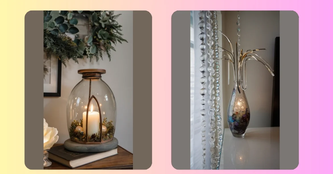 This totally awesome glass décor is perfect for making your home feel extra festive! Imagine this: it’s almost Christmas, you’ve got a mini tree twinkling in the background (because who doesn’t love a mini tree?), and this gorgeous glass holder with pinecones and a warm, glowing candle is sitting on your coffee table. It’s like a little winter wonderland, all snug and cozy, ready for hot chocolate and holiday movies. The pinecones add that perfect touch of rustic charm, while the candle creates a magical ambiance. Seriously, it’s the ultimate in home glass decor!