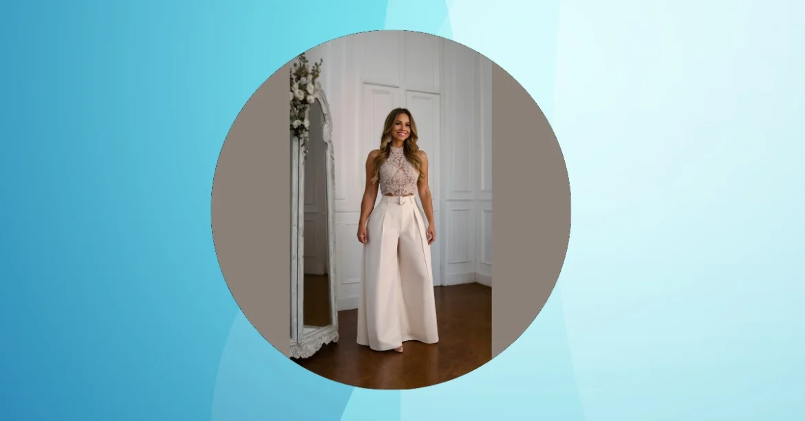 This woman’s outfit is seriously stylish! Imagine being in your mid-thirties and looking this fab. That creamy, dreamy wide-leg pant suit is totally on point. It’s like she’s stepped out of a fashion magazine, ready to conquer the world (or at least, a really nice brunch). The lace top adds a touch of elegant sass, you know, just enough to make everyone jealous without being too over-the-top. It’s the perfect example of how to look put-together and comfortable at the same time – you could totally wear this to a wedding, a job interview, or maybe even a superhero convention (if superheroes wear classy pantsuits, that is!).