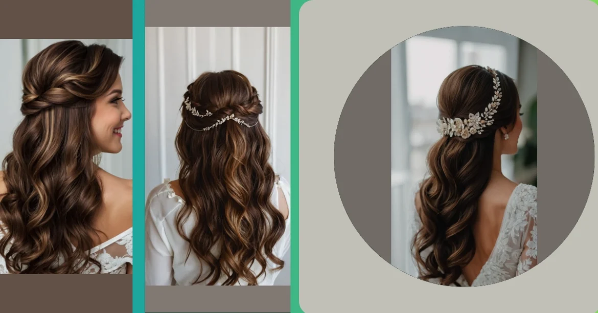 This picture shows a gorgeous bridal hairstyle that’s totally on point! It’s half up, half down, just like the keyword says, but it’s so much more than that. The loose curls are super romantic, and that sparkly hairpiece? It’s like something a princess would wear! Seriously, it adds the perfect touch of sparkle without being too over-the-top. You could totally rock this look at your own prom or a fancy party, not just a wedding!