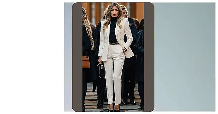This woman’s outfit screams “Parisian chic” but with a modern twist! Imagine strolling down the Champs-Élysées in this creamy white power suit – you’d be turning heads faster than a baguette flies off a bakery shelf. It’s the perfect blend of sophisticated and stylish, like a delicious croissant with a side of confidence. The crisp white pants and matching blazer are seriously boss-level, and those killer heels? They’re the cherry on top of this fashionable sundae. Who needs a beret when you’ve got this?