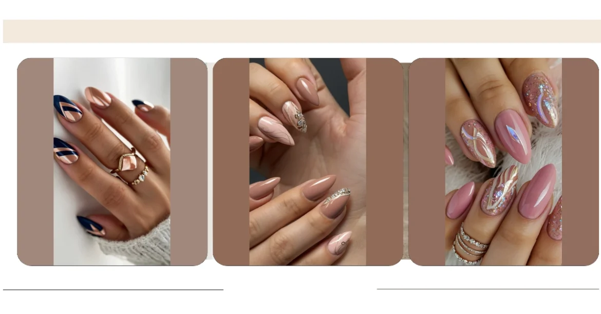 These almond nails are seriously next-level! Look at those gorgeous, subtle nude shades – they’re like the perfect neutral canvas, ready for anything. Then, BAM! Some nails get fancy details, like delicate gold swirls and sparkly gems. It’s like the nail version of a simple outfit with a statement piece of jewelry; effortlessly chic! You could rock these for a fancy dinner or just chilling with friends—they’re versatile enough to handle it all.