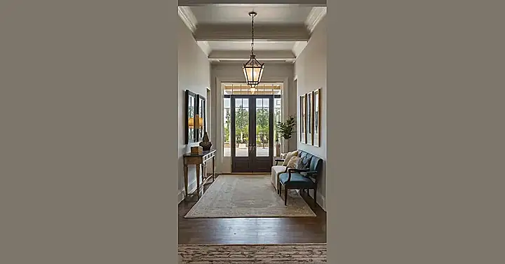 This hallway is seriously giving “entryway envy.” Just look at that gorgeous rug, it’s like stepping onto a cloud (a very stylish, patterned cloud!). And that fancy chandelier? It’s practically begging you to take a selfie underneath it. Forget boring hallways; this space is ready for a magazine photoshoot, complete with a comfy little couch for guests who are just *dying* to admire your impeccable decorating skills. Seriously, ditch the sad, lonely houseplant; this hallway is about making a statement!
