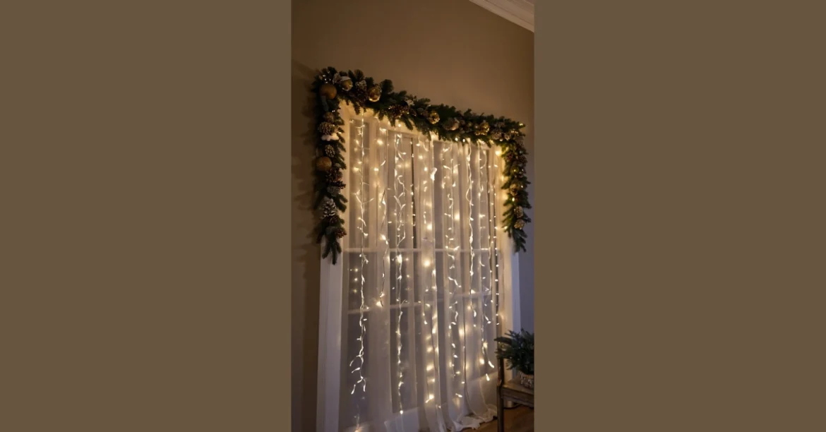 This window is totally rocking the “indoor Christmas decorations” game! Imagine snuggling up on the couch with hot cocoa, watching the snow (or rain, let’s be real) fall outside, and seeing this magical light show. It’s like a sparkly, golden garland decided to have a party with a bunch of fairy lights, and they all invited sheer curtains to the bash. Seriously, who needs a fireplace when you have this much cozy Christmas cheer?