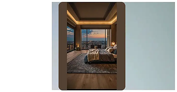 Seriously though, this bedroom is all about relaxing. The soft lighting, the plush bed, and that view? It’s like stepping into a postcard of peace and quiet. Forget counting sheep – you’ll be counting skyscrapers as you drift off to sleep. Plus, can we talk about the floor? That wood looks so smooth, you could probably slide into bed without making a sound – which is a definite plus for anyone who likes a good, uninterrupted snooze.
