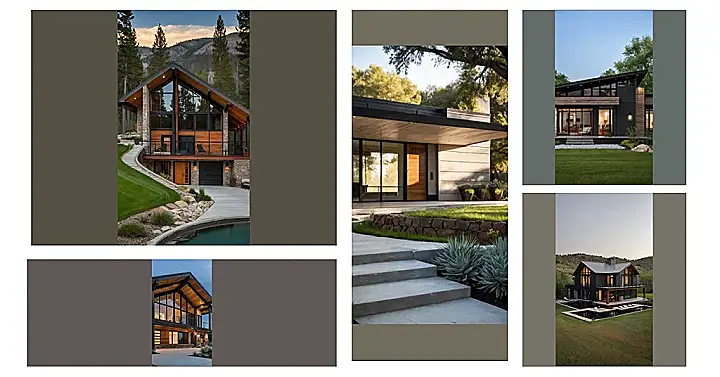 This modern ranch house isn’t your grandma’s ranch! Imagine: huge windows showing off the amazing mountain view, like a giant picture frame for nature. It’s got that cool, modern look with sleek lines and stone, but it’s also super cozy and inviting, like having a fireplace and comfy chairs on a deck after a long hike. It’s basically a total upgrade on the classic ranch, ready to host epic movie nights while you look out at the stunning scenery.