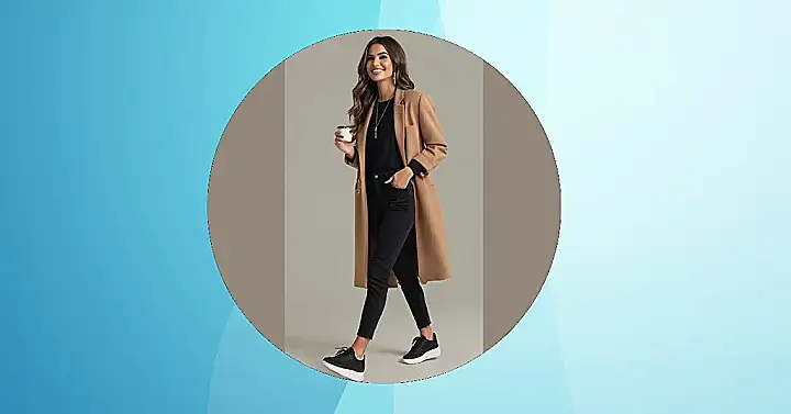 This outfit is giving major “I woke up like this (but secretly spent five minutes picking out the perfect sneakers)” vibes. The camel coat is like a warm hug, perfect for chilly days when you still want to look totally put-together, but without the stress of a super fancy dress. Those black jeans and comfy black shoes? They’re the unsung heroes of this look. It’s cute, it’s casual, and honestly, you could totally rock this to school, grab coffee with friends, or even a low-key date.