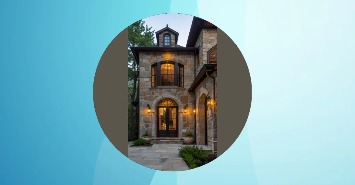 Wow, check out this amazing house! It’s like something out of a fairytale, but instead of bricks, it’s built from seriously cool-looking stones. Imagine living here – you’d feel like royalty stepping through those massive, fancy doors every day. The stone exterior is so stylish; it’s like the house is wearing a really expensive, rugged outfit. It totally reminds me of a castle, but way more comfy and modern inside. I bet they have the best movie nights, because who needs a TV when you’ve got such awesome architecture?