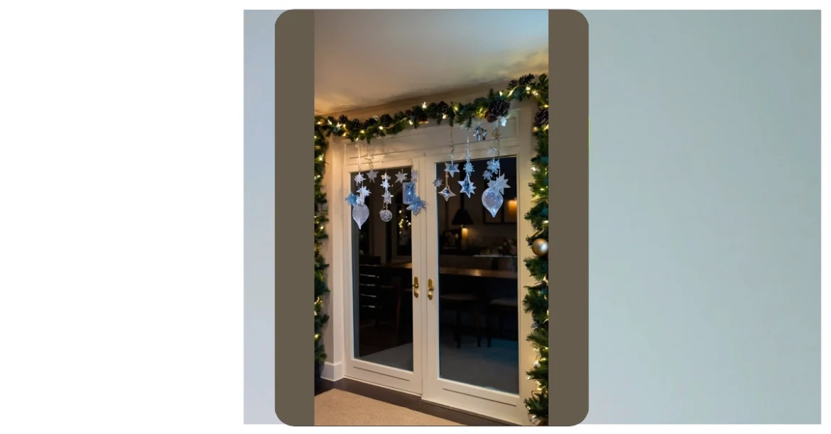 Wow, check out these sparkly snowflakes and ornaments hanging from the door! They’re like a little winter wonderland, all shimmery and festive, making the whole room feel extra Christmassy. It’s way better than just sticking a wreath on the door – this is next-level indoor Christmas decorations! Imagine how magical it would be to walk through those doors every day in December.