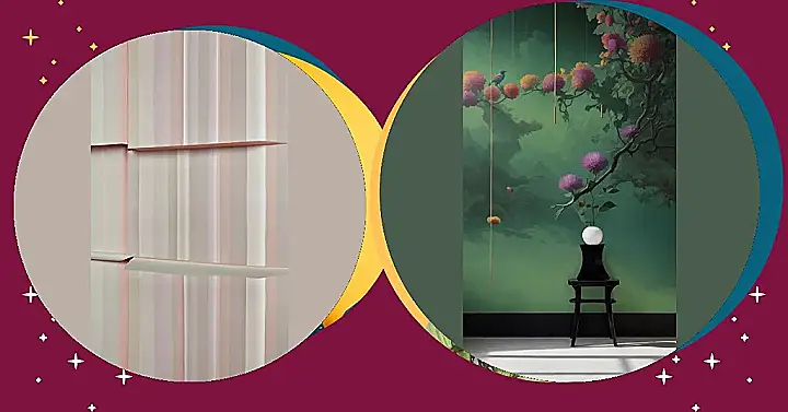 That wallpaper is seriously wild! It’s like a swirling mix of colors and shapes, a bit like if a painter got really, really into abstract art and decided to cover a whole wall with it. Imagine trying to explain this design to your grandma! But hey, that dusty rose armchair looks super comfy nestled against it. It’s like the chillest, most stylish spot in the house for a good book and some quiet time – especially if you’re trying to avoid explaining the wallpaper.