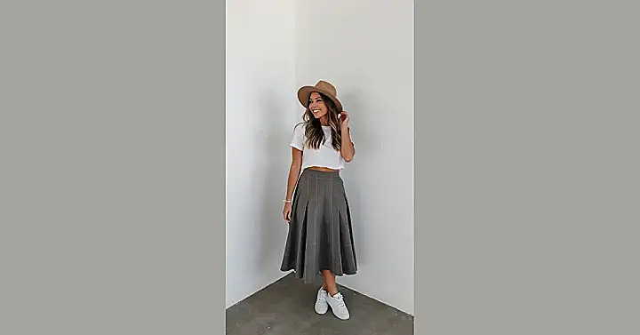 Seriously, this look proves that fashion rules are meant to be broken! This simple outfit shows how you can mix and match different styles to make something unique and totally you. You can totally rock a midi skirt for a casual day out, showing everyone that comfy and stylish can coexist. No need for heels, sneakers add a fun, sporty vibe that makes the look even better. So, ditch the stuffy dress code, grab your sneakers, and rock that midi skirt with confidence!