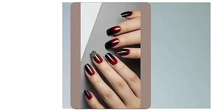 Forget boring nail polish; this look proves that simple nail art can be super sophisticated. It’s like a perfectly blended sunset, but on your fingertips. The dark base gives it a mysterious vibe, while the fiery red top coat adds a touch of drama. Plus, you could totally rock this look with anything – from jeans and a tee to your fanciest outfit. It’s the kind of manicure that says, “I’m awesome, and I know it,” without being too loud about it. Seriously, ditch the plain polish, and try this!