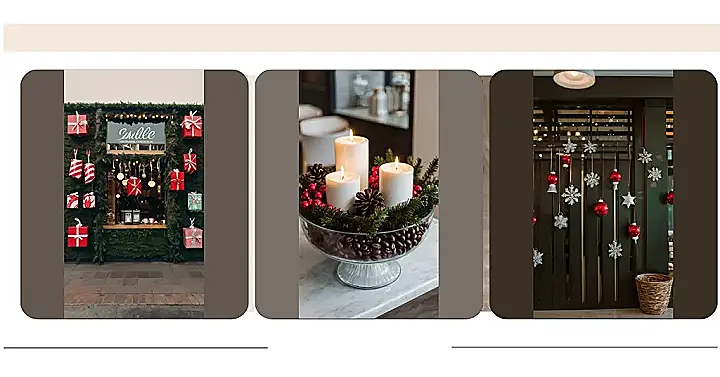 This festive display is pure coffee shop Christmas magic! It’s the perfect blend of rustic charm and holiday cheer. Who needs a giant inflatable snowman when you’ve got a gorgeous arrangement of nature’s goodies and the warm glow of candlelight? It would totally make your Instagram feed look more magical than a unicorn riding a reindeer. Seriously, it’s the kind of decor that makes you want to stay longer, sip your latte, and dream of snowy adventures.