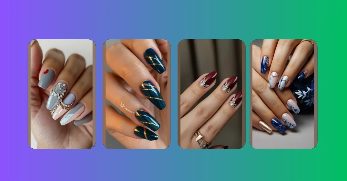 These nails are like a winter night sky, all sparkly and mysterious! Imagine snuggling up with a cat on a snowy evening, that’s the vibe these nails give. You’ve got the elegant, pale pinks and nudes, like freshly fallen snow, mixed with rich, deep blues like a twilight sky. Plus, those tiny gold accents? They’re like the little stars twinkling above! It’s the perfect blend of cozy and glamorous – totally ready for a winter snowball fight (or a hot chocolate date).