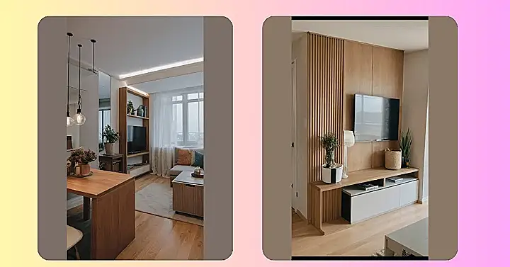 This small apartment living room is proof that big style doesn’t need a big space! That amazing wooden divider is like a secret passage to another room (even if it’s just a cleverly hidden storage area!). Imagine all the cool things you could hide behind those stylish slats – maybe a collection of vintage board games or a secret stash of delicious snacks. It’s like having a mini-mystery in your already awesome apartment!