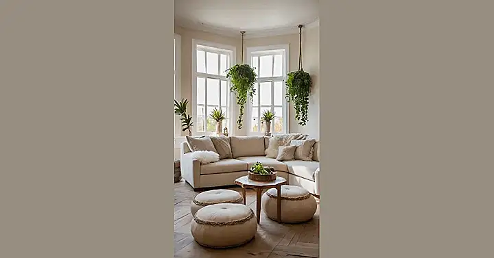 This room is seriously giving me major chill vibes! Look at that comfy beige couch, perfect for sprawling out with a good book. And those hanging plants? They’re like little green waterfalls, bringing the outside in and making the whole place feel fresh and natural. It’s total “natural home decor” goals – a super relaxed space that’s both stylish and inviting. You could totally imagine yourself napping on those fluffy poufs after a long day of school.