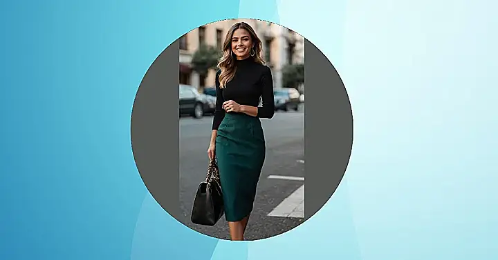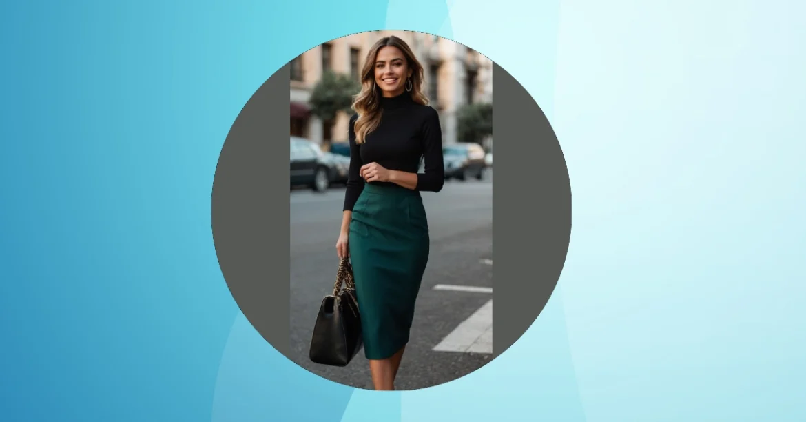 This girl is totally rocking the “stylish work outfits for women” look! That emerald green pencil skirt and black turtleneck are a killer combo – it’s professional, but seriously chic. Imagine yourself striding into school, totally owning your day in this outfit. Forget frumpy uniforms, this is what power dressing looks like! You’ll be the envy of everyone, and maybe even impress your teacher with your fashion sense.