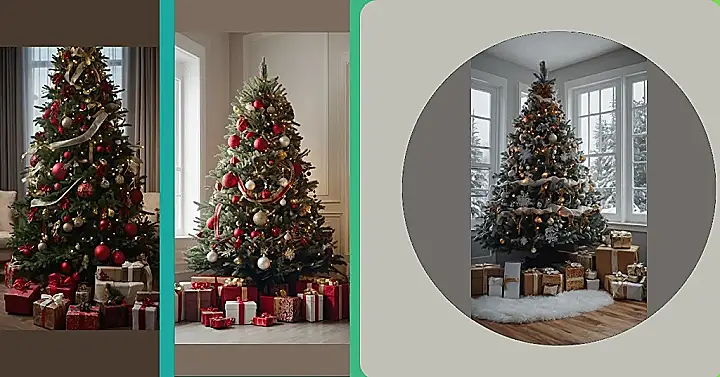 This Christmas tree is seriously decked out! Look at all those shiny ornaments, the gorgeous ribbons, and those perfectly wrapped presents at the base – it’s like a Christmas explosion of red and gold! It’s the kind of tree that makes you want to grab a hot cocoa, snuggle up on the couch, and maybe even believe in Santa again (even if you’re almost too cool for school!). It’s giving major “Christmas card” vibes, and definitely beats a sad, lonely little tree in the corner.