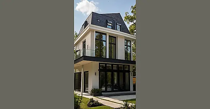 This house is seriously stylish! Look at that awesome roof – it’s like a fancy hat on a super-cool building. The dark gray shingles are sleek and modern, and the little windows in the roof are like secret peek-a-boo holes for the people who live there. The whole thing is so sharp and geometric, it almost looks like it belongs in a video game! Imagine having parties up on that balcony, overlooking all your neighbors’ much less interesting houses.