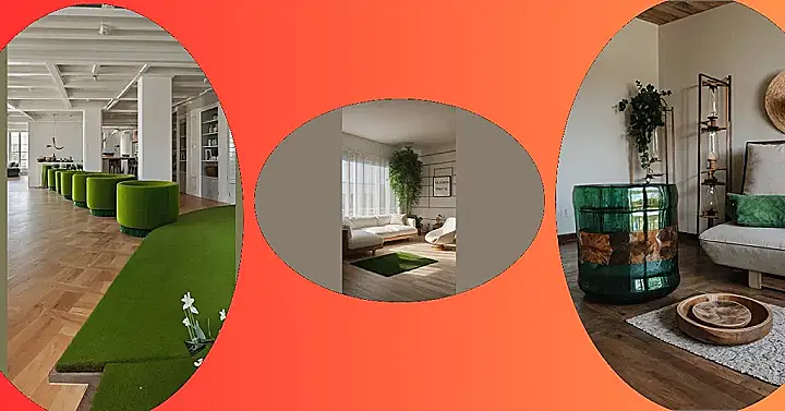 Imagine a room so cool, it’s got comfy green chairs that look like giant marshmallows, all lined up like they’re ready for a party! And get this – the floor even has a grassy patch with tiny white flowers popping out, like a mini-garden just chillin’ in the middle of the house! It’s like stepping into a super-relaxed, eco-friendly wonderland where your worries melt away faster than ice cream on a hot day.