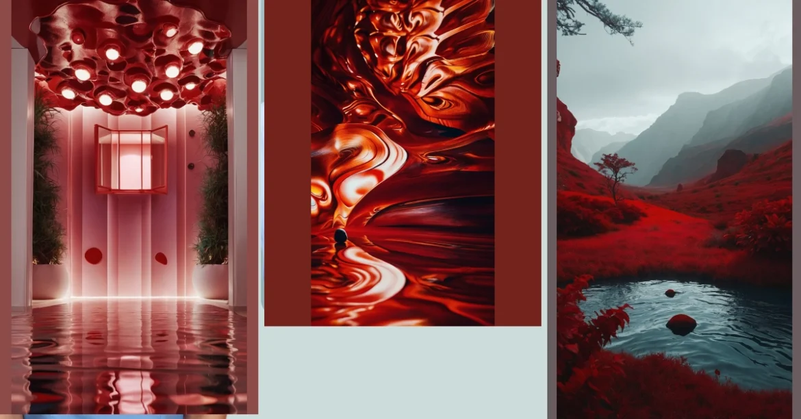 Wow, check out this place! It’s like stepping into a giant, super-stylish, red-themed candy land. The ceiling looks like a melted strawberry swirl with tiny lights peeking through, and the walls are a beautiful blush pink that’s almost as sweet as cotton candy. The floor? It’s like a giant, reflective puddle of cherry juice – it’s so shiny you can almost see yourself swimming in it! This definitely beats your average “red wallpaper” situation.