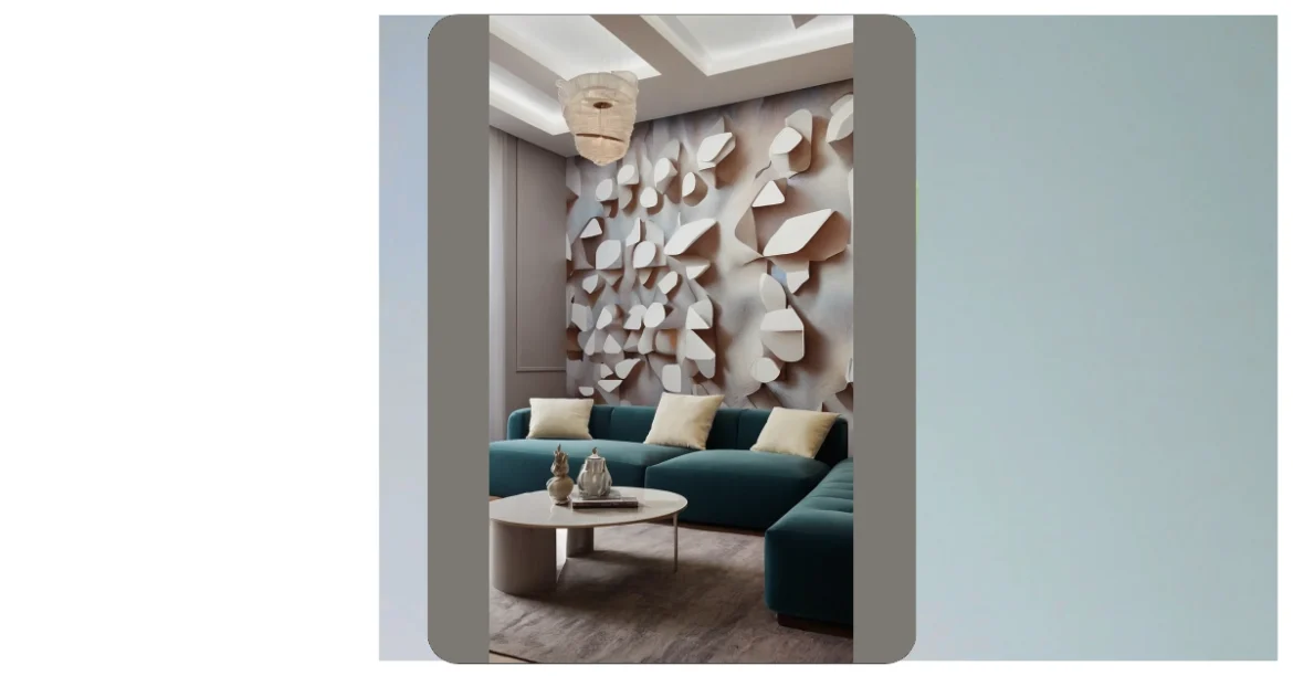 This living room is seriously groovy! Check out that wallpaper – or is it? It looks less like traditional wallpaper and more like someone sculpted a bunch of creamy clouds and stuck them on the wall. It’s so unique, it’s like stepping into a dream made of marshmallows! The furniture matches perfectly, all soft and comfy-looking; it’s the kind of room where you could totally relax and binge-watch your favorite shows without a care in the world.