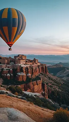 Imagine you’re floating in a hot air balloon, gently drifting over a place that feels like it’s straight out of a fairy tale. You’re looking down at a town nestled on top of a rocky mountain, with houses that look like they were built by gnomes. The sun is setting, painting the sky in a beautiful blend of pink and orange, making it look like a giant, magical sunset painting.