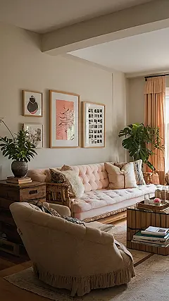 This room looks so comfy, it’s like a hug in furniture form! The pink couch is totally giving off vintage vibes, like something your grandma would have, but in a cool, modern way. Plus, all the plants make it feel like you’re hanging out in a chill jungle oasis, not just your living room. It’s like, you could totally imagine writing your epic poem here, or maybe just binging Netflix, but either way, inspiration is guaranteed.