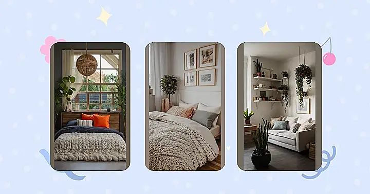 This room is like a chill-out zone from a movie! The mix of comfy cushions and cool art prints makes you feel like you could actually relax and read a book instead of just scrolling through TikTok. I love how the plant brings a bit of the outside in, so you don’t have to leave your comfy space to feel closer to nature, it could even inspire you to work on homework with a view.